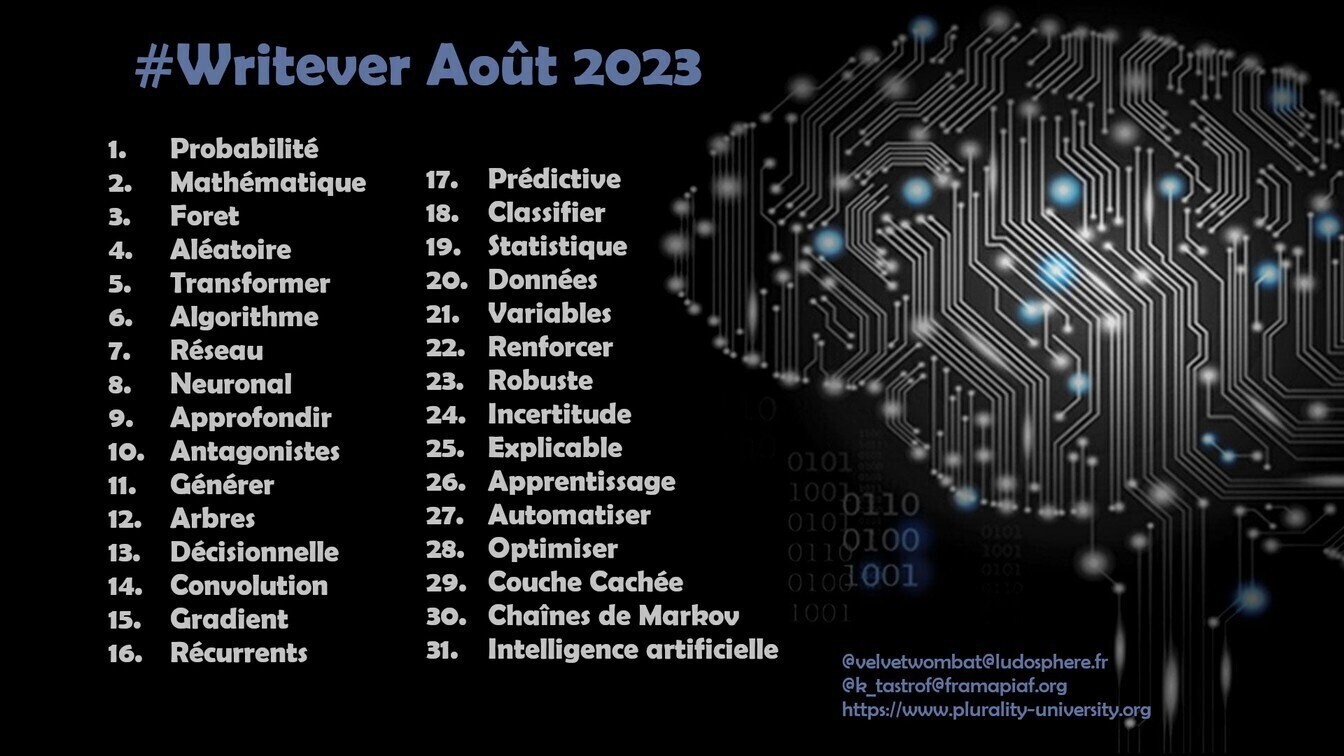 Depuis longtemps je voyais passer des #writever sur les réseaux et, ce mois-ci, je m’y suis mis. Le principe est le suivant : pour chaque jour du mois est proposé un mot. Chaque participant écrit un petit texte inspiré par ce mot, de manière assez libre, si possible un par jour (mais souvent, on prend un peu de retard, vite rattrapé.) Je l’ai fait sur Mastodon, sur le serveur piaille, où j’étais limité à 500 caractères, ce qui permit d’éviter les dispersions.