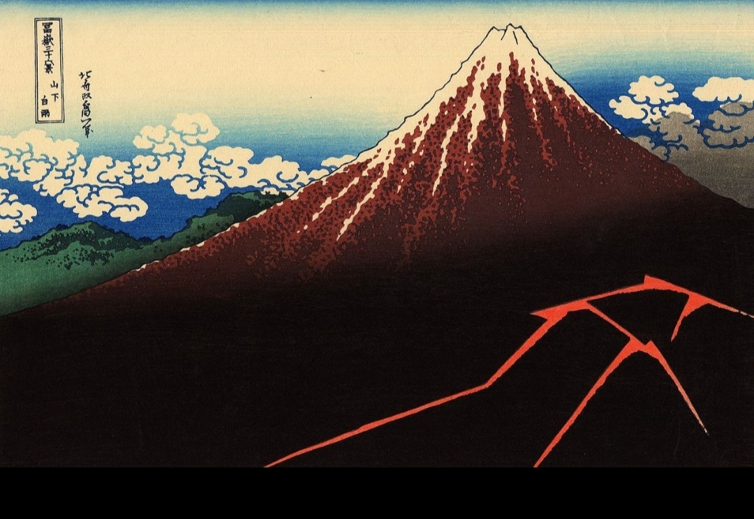 L’estampe L’Orage sous le sommet est frappante par son ombre étendue et son éclair. Comme La Grande Vague, elle évoque une catastrophe naturelle, mais cette fois-ci propre à la montagne : l’éruption. La dernière éruption connue du Fuji date de 1707. Hokusai dessine une centaine d’années plus tard, mais le souvenir n’en est pas si lointain. Les éclairs rouges, pour quelqu’un qui ne connait pas le titre, pourrait évoquer des trouées formées par la lave coulant de la montagne.