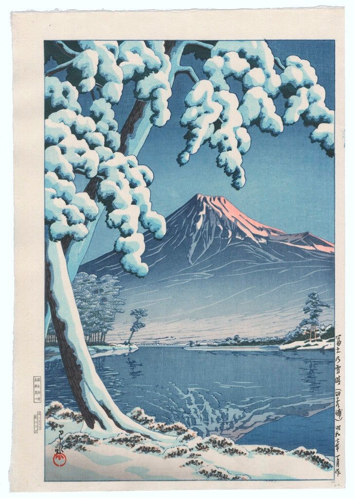 Parmi les grands auteurs d’estampes, j’ai de plus en plus d’affection pour Hasui Kawase. On le connait moins en France, parce qu’il n’a pas la prééminence de l’ancienneté : il n’a pas, comme Hokusai et Hiroshige, été travaillé en profondeur par des peintres européens, Van Gogh en tête. Il a continué l’art de l’estampe au coeur du XXe siècle, mêlant les thèmes traditionnels des saisons (avec une prédilection pour les paysages enneigés) et les visions modernes (l’architecture du Tokyo moderne).