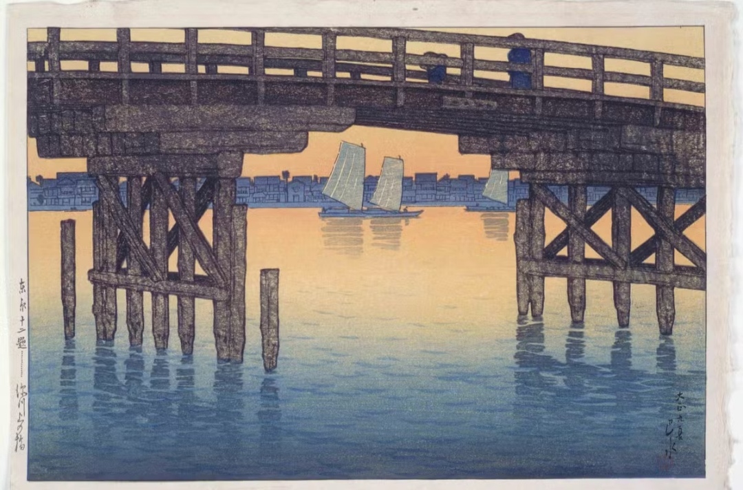 J’aime les représentations de ponts. Pourquoi ? Sait-on pourquoi on apprécie tel thème plutôt qu’un autre ? Il y en a beaucoup chez Hokusai, j’ai eu l’occasion d’en décrire l’été dernier. Ici, c’est un pont moderne, au moment de la modernisation urbaine du Japon, dans les années 1920. Le thème du mouvement inhérent au pont est redoublé par les bateaux au second plan et les bâtiments modernes à l’arrière-plan. Triple mouvement humain, auquel s’ajoute le mouvement de l’eau. Hasui Kawase, dans une œuvre résolument contemporaine, rejoint l’origine de l’ukiyo-e : le monde flotte, le monde se meut et va disparaître.